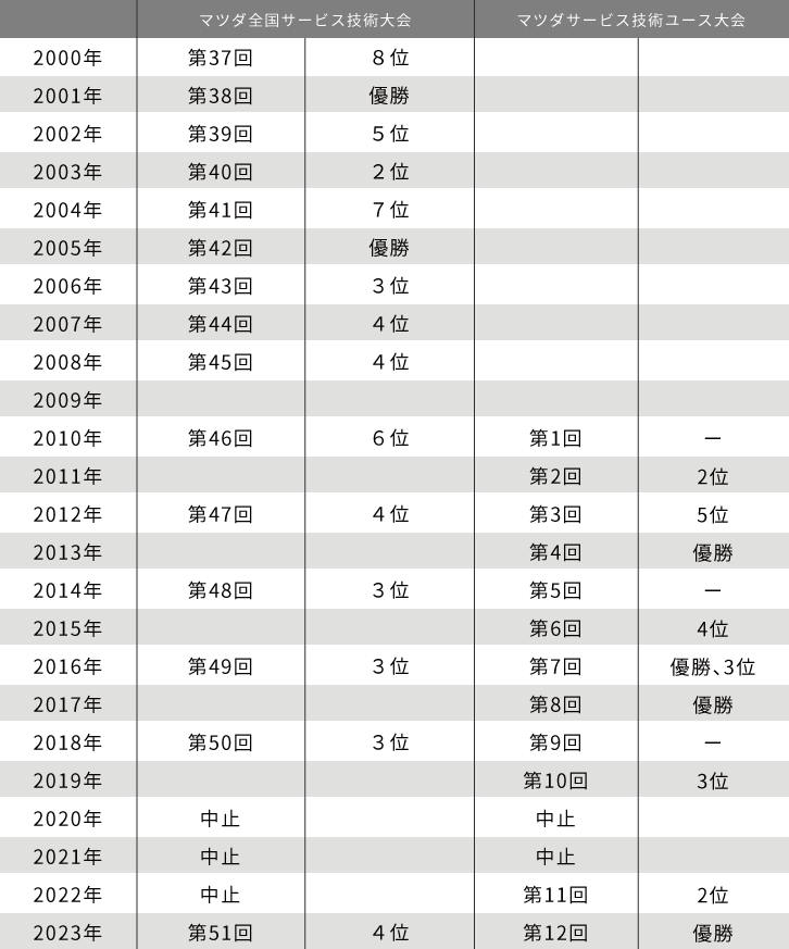 ※2020年・2021年は、新型コロナ感染予防のため「マツダ全国サービス技術大会」「マツダサービス技術ユース大会」の開催を中止いたしました。